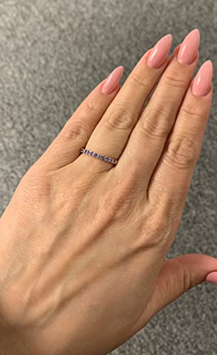 The ring is described as dainty and stackable, ideal for layering with other rings.